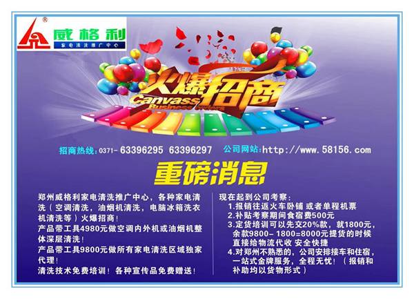 洗多多家電清洗招商加盟中心推出的有家用空調(diào)內(nèi)外機(jī)清洗,車用空調(diào)清洗,油煙機(jī)清洗,飲水機(jī)清洗,電腦清洗,太陽(yáng)能清洗,洗衣機(jī)清洗,冰箱清洗,中央空調(diào)清洗,各種家電清洗等清洗項(xiàng)目20多個(gè)。這些品類都是投資少,賺錢快,低風(fēng)險(xiǎn)高收益的特別適合創(chuàng)業(yè)的好項(xiàng)目。、家電清洗加盟廠家,家電清洗設(shè)備生產(chǎn)廠家,家電清洗劑,家電清洗設(shè)備
