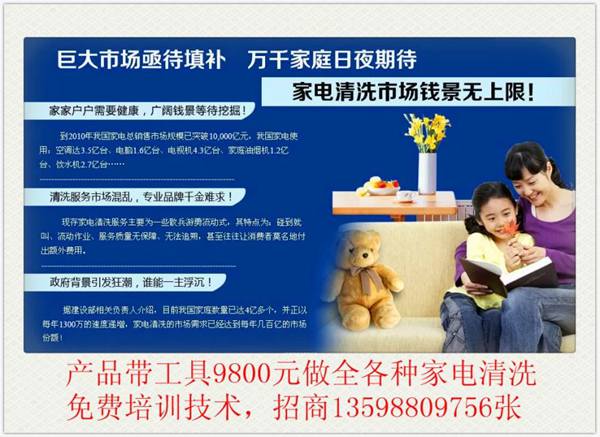 2.我們招商的門檻更低,產(chǎn)品帶工具只要9800元就可以做*各種家電清洗項目。其他品牌收的都有金額不同加盟費,我們是沒有*形式的加盟費的,不讓加盟商多花一分錢。
