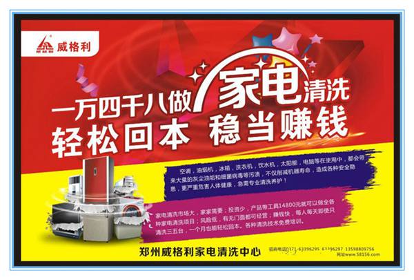 家電清洗市場大,家家需要;投資少,產(chǎn)品帶工具14800元就可以做*各種家電清洗項目;風險低,有無門面都可經(jīng)營;賺錢快,每人每天即使只清洗三五臺,一個月也能輕松回本。各種清洗技術*費培訓!
