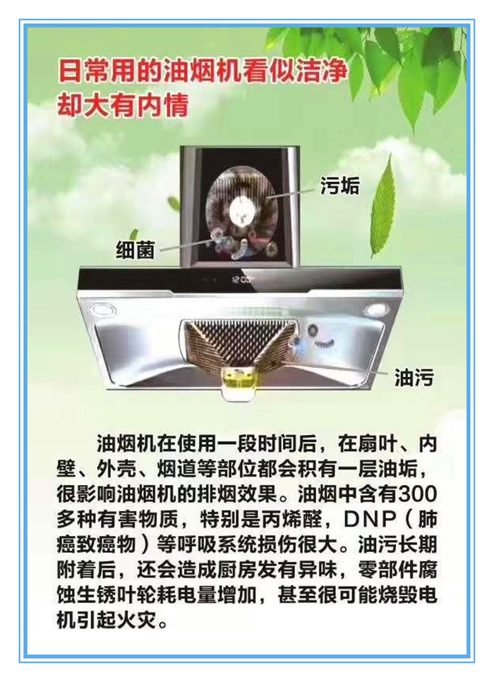 第四、葉輪、煙道上的油污增加了粘性,使排氣不暢通,增加了油煙在廚房空間上的擴散,危害人體健康。