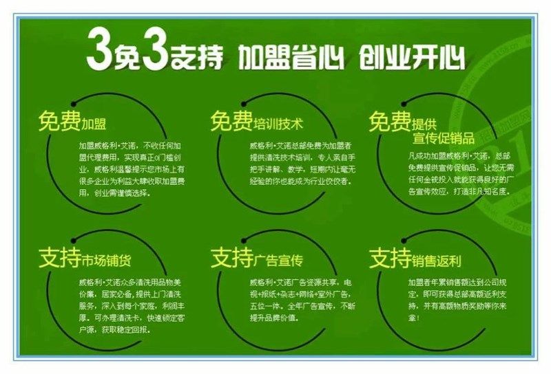 鄭州威格利作為家電清洗加盟商較大的后盾,加盟鄭州威格利*需14800元,小投資大回報(bào)的創(chuàng)業(yè)項(xiàng)目,還包括各種清洗技術(shù)也是*費(fèi)培訓(xùn),加盟商在實(shí)際工作中需要用到的宣傳物料也是公司*費(fèi)配送,只是需要配置專(zhuān)業(yè)的清洗產(chǎn)品和工具,這14800元就包括了20箱不同的家電清洗劑(每箱30罐)和4套多功能的清洗工具.
