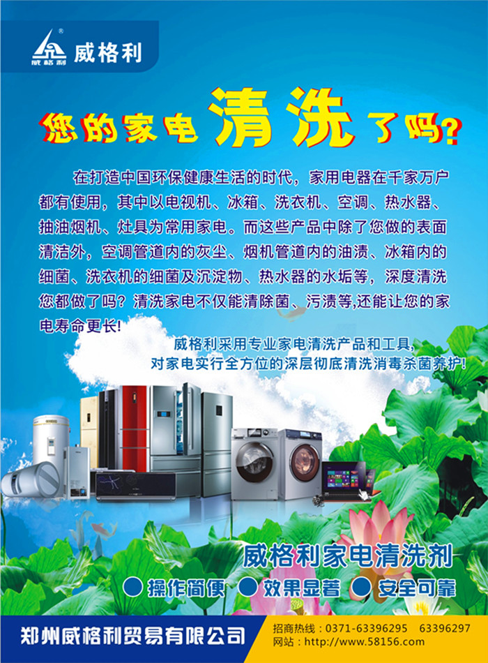 完善的商標(biāo)可以充分的*我們威格利家電清洗品牌的商譽(yù)不受侵害,這也是我們公司對(duì)眾多的加盟商的一個(gè)支持和保障!威格利---洗出健康好電器!